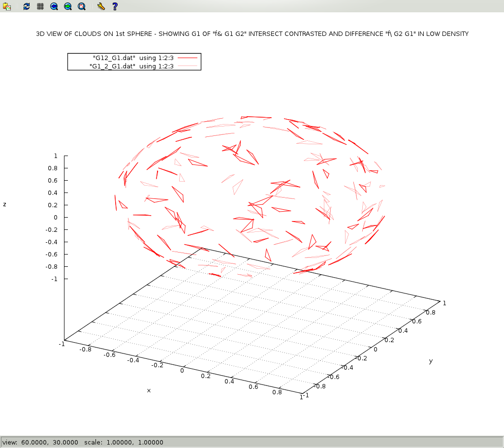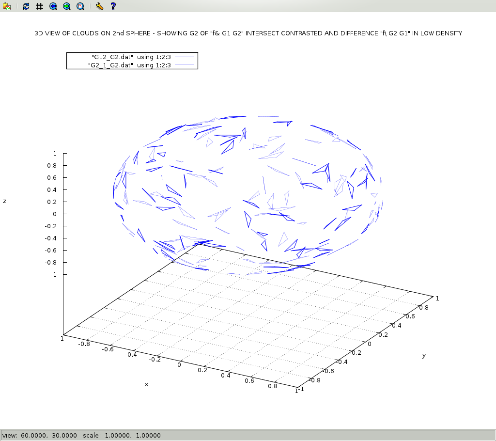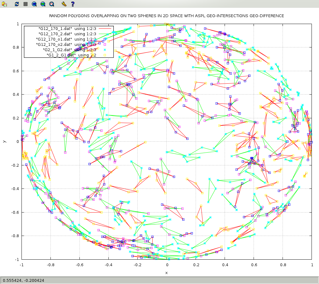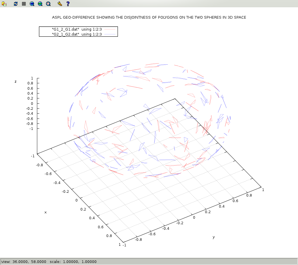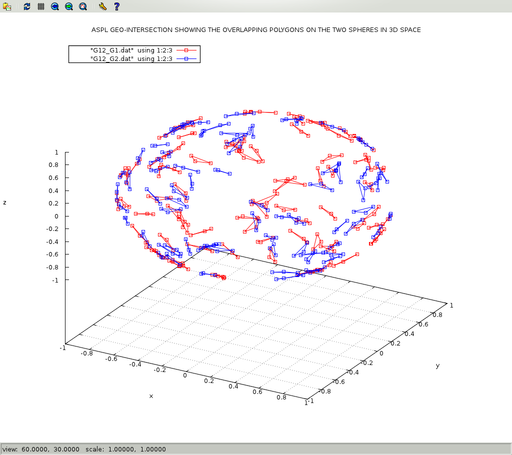 This workspace shows how to use ASPL operators to do contextual set operations on geometric data. Worspaces that have a name suffixed with GEO causes ASPL to switch its f& and f\ operators to do contextual set intersection and set difference according to contextual routines, here they are the GEOmetric routines. This workspace shows the power of ASPL set operators when performing operations on geometric data set. In this example we will call the GG function ggRPO2Sov() to create 170 polygons, namely triangles, on two spheres. The result is assigned to G12_170, and the labeling of the first sphere is G1, and of the second sphere is G2. We will split the resulting set variable G12_170 into two set variables G1 and G2: G1 contains the first sphere polygons, and G2 contains the second sphere polygons. We will call f& on G1 and G2 to get their intersects, and assign the result to G12. We will call f\ on G1 and G2 to get their difference, and assign the result to G1_2. We will call f\ on G2 and G1 to get their difference, and assign the result to G2_1. The merge operation shown below is not required with latest version of ASPL. The merge of a variable into itself will just add a GADg to the variable, but if it is not needed then spare the memory. Finally we will dump the GADg of the variables so that we can plot them with drawgad command. Read the ASPL book on how to create GEO workspaces. In this tutorial the 'aspl>' refers to the ASPL prompt, and the '#' refers to the shell prompt.