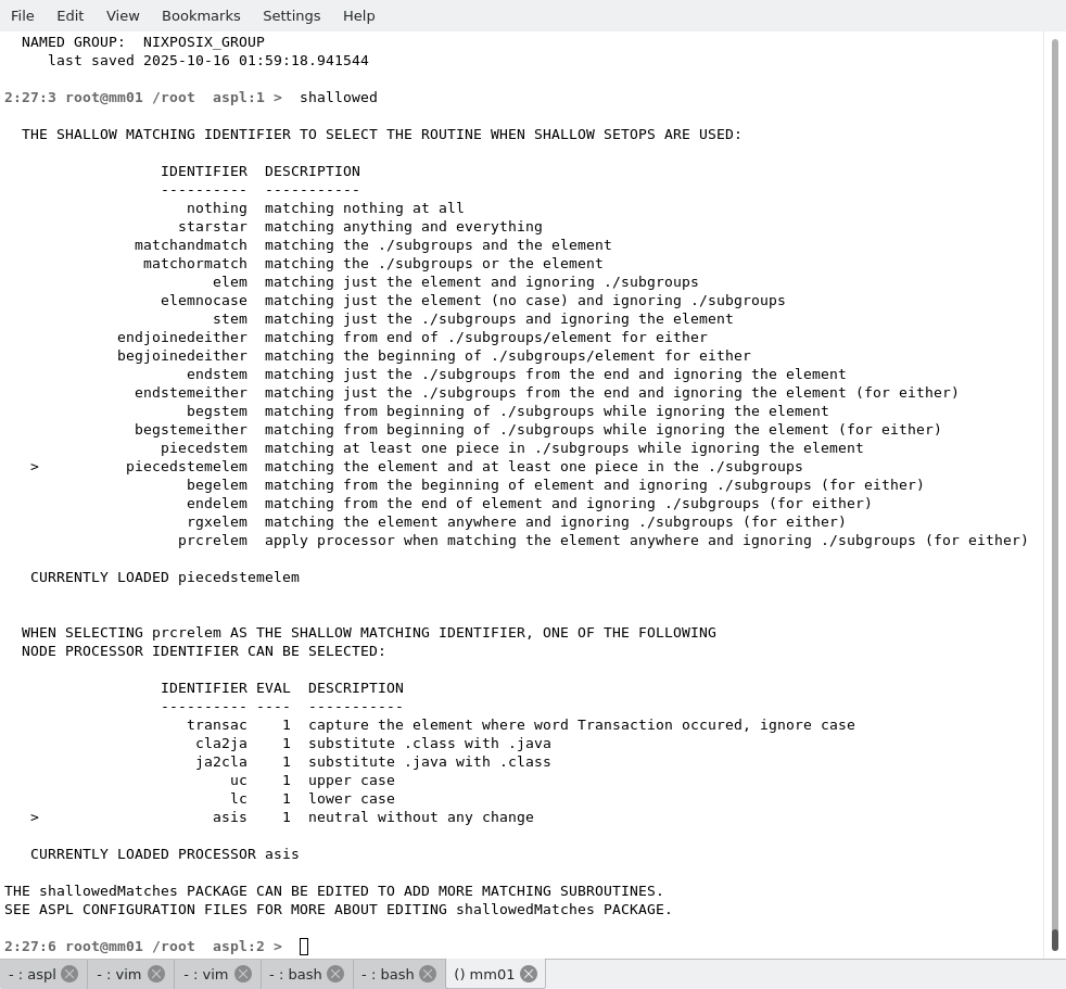 Shallow matching is a match between two strings performed through some intermediate function that takes as input both strings, then returns true or false. ASPL provides shallow matching through an internal module, and offer the user to edit and make changes to the functions of the module. The shallow module functions are selectable, the ASPL command shallowed displays the current shallow function being used by ASPL, and the command ~shallowed edits the shallowed module.