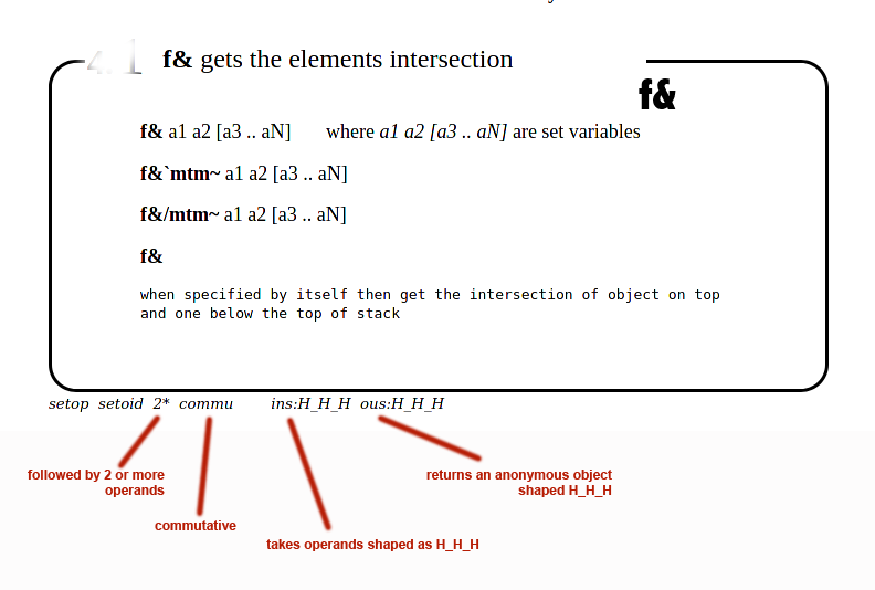 In this guide, the mnemonic of each symbolic set operator is shown in its own page. The page starts with a box, called syntax box, where the operator and a brief title is heading the box. At the bottom of the syntax, you can locate information about the property of the operator, along the input and output of the operator.