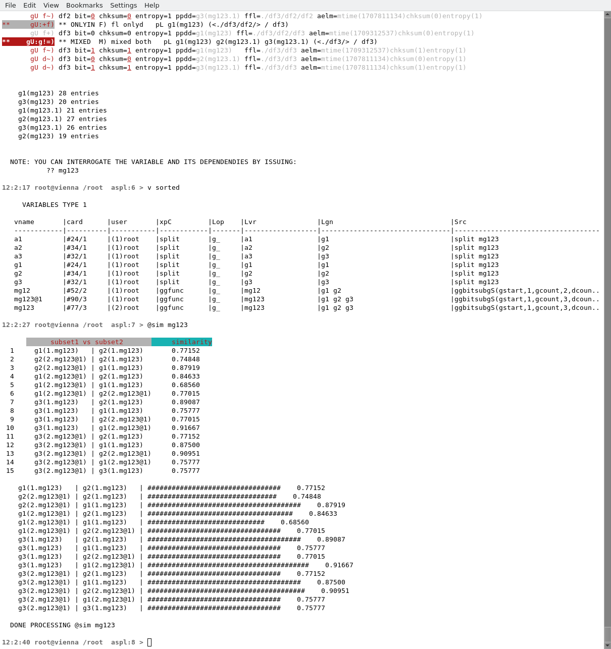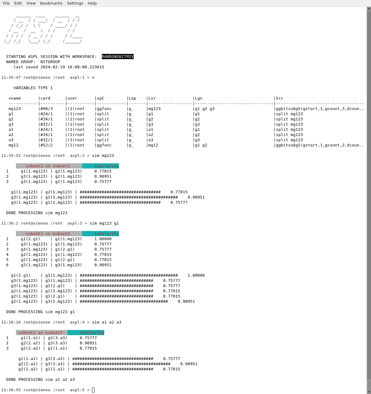 similarity EXAMPLE2In the sample workspace RANDONEBITMIX we created random groups, subgroups, and elements, then saved their results into set variables. In this example, we start ASPL loading the sample workspace RANDONEBITMIX and show the commands to interrogate the similarity of a set variable.