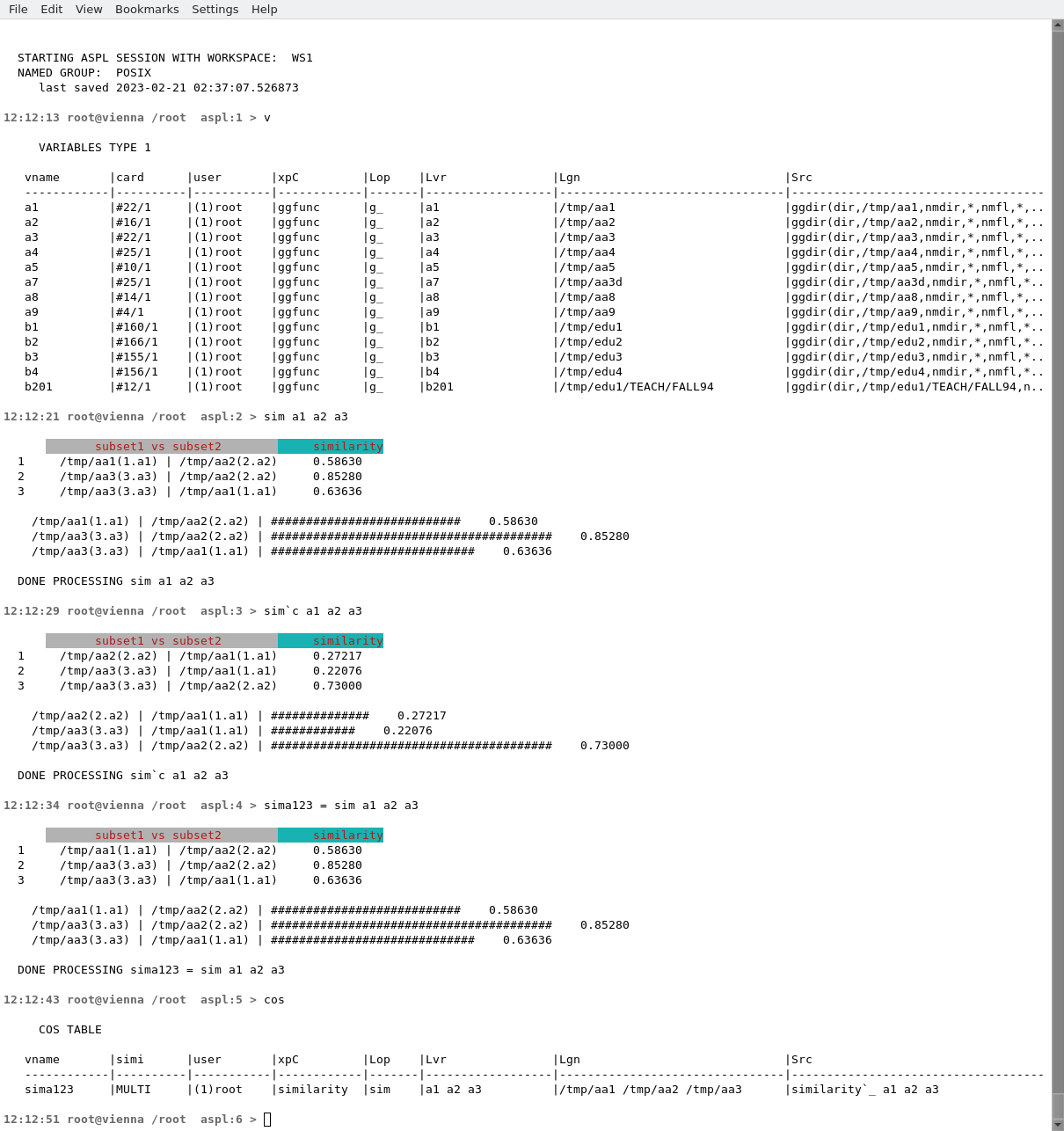 We can also save the similarity results into COS variables. ASPL has a COS symbol table where COS variables are saved. You can display the content of the COS symbol table with the COS command, and you can even interrogate a COS variable by preceding it with the COS interrogation operator ?c.