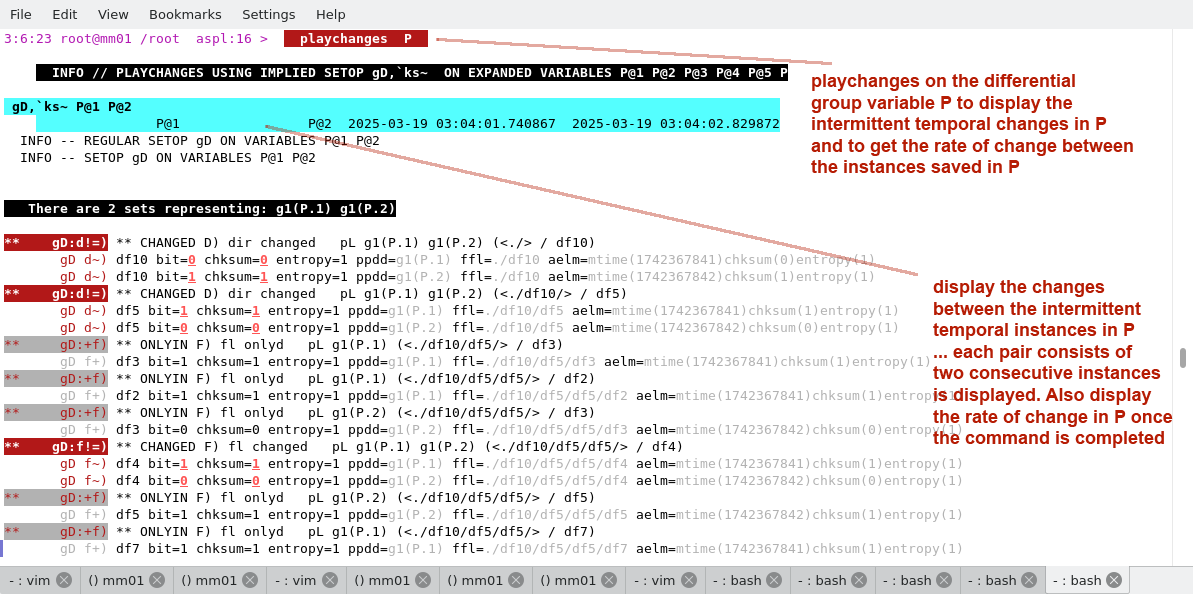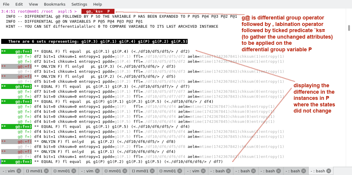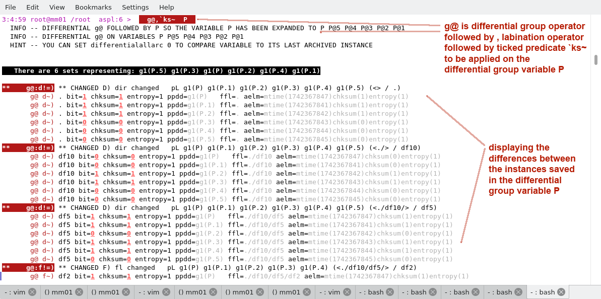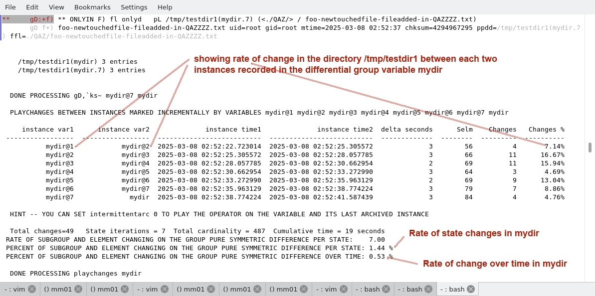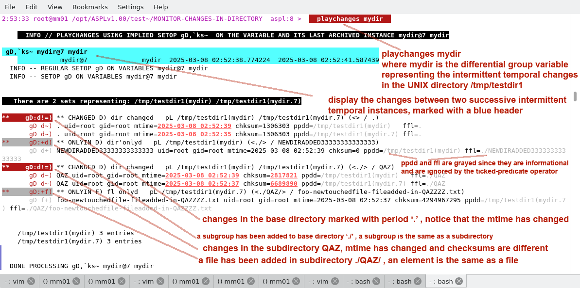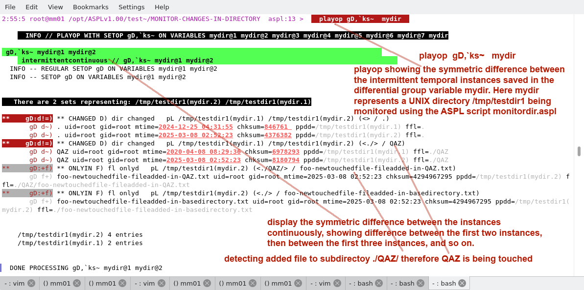 The script monitordir.aspl is run to monitor the directory /tmp/testdir1. The changes in the directory are recorded in the differential group variable mydir. Here we show the changes in the directory by using various ASPL operations.