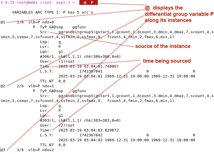 This appendix contains miscellaneous notes explaining how to interpret the output on operations carried out in ASPL on differential group variables.
