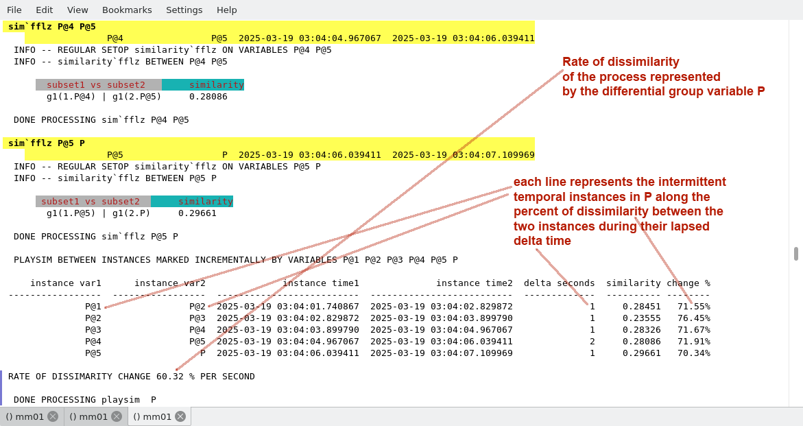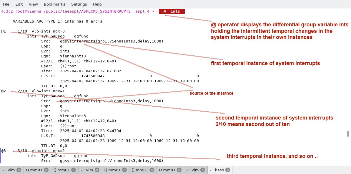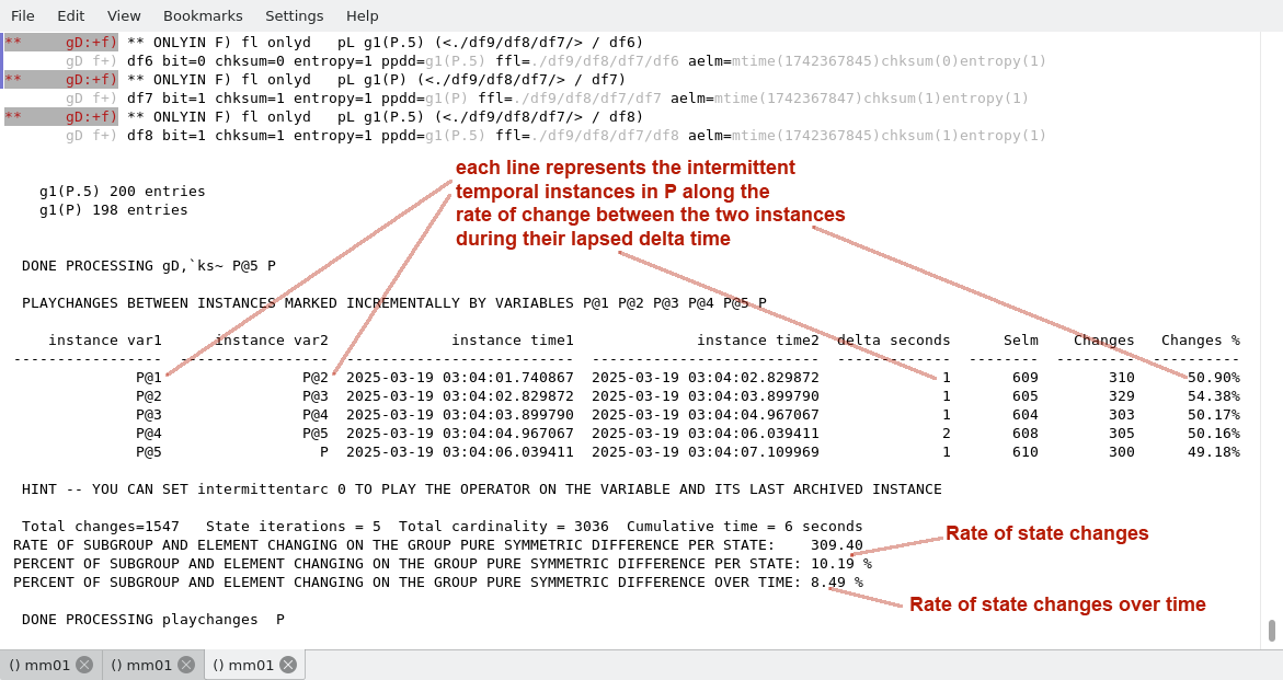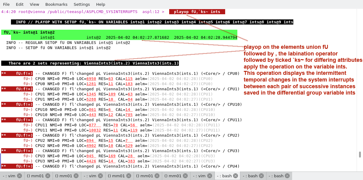 Since the ints identifier represents a differential group variable (where we recorded the changes in state of the system interrupts), it is possible to use the command verb playop on the set operator displaying the union of these recorded datasets. The following figure shows the operation
