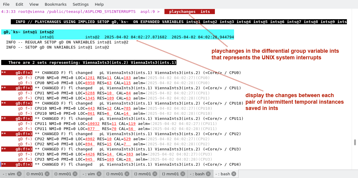 To find the changed states in UNIX system interrupts ints, we use the command verb playchanges on the differential group variable ints.