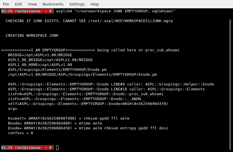 asplcmd "createworkspace JUNK EMPTYGROUP; egCwhoami"