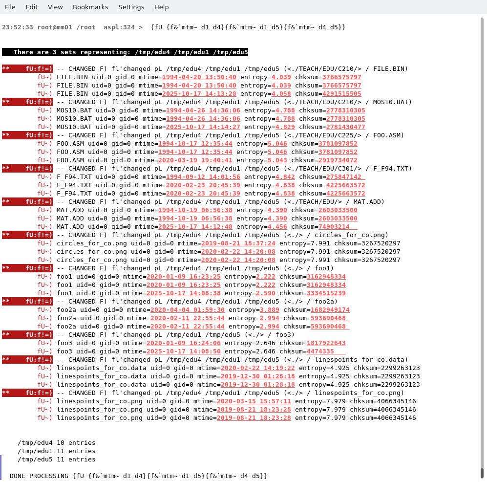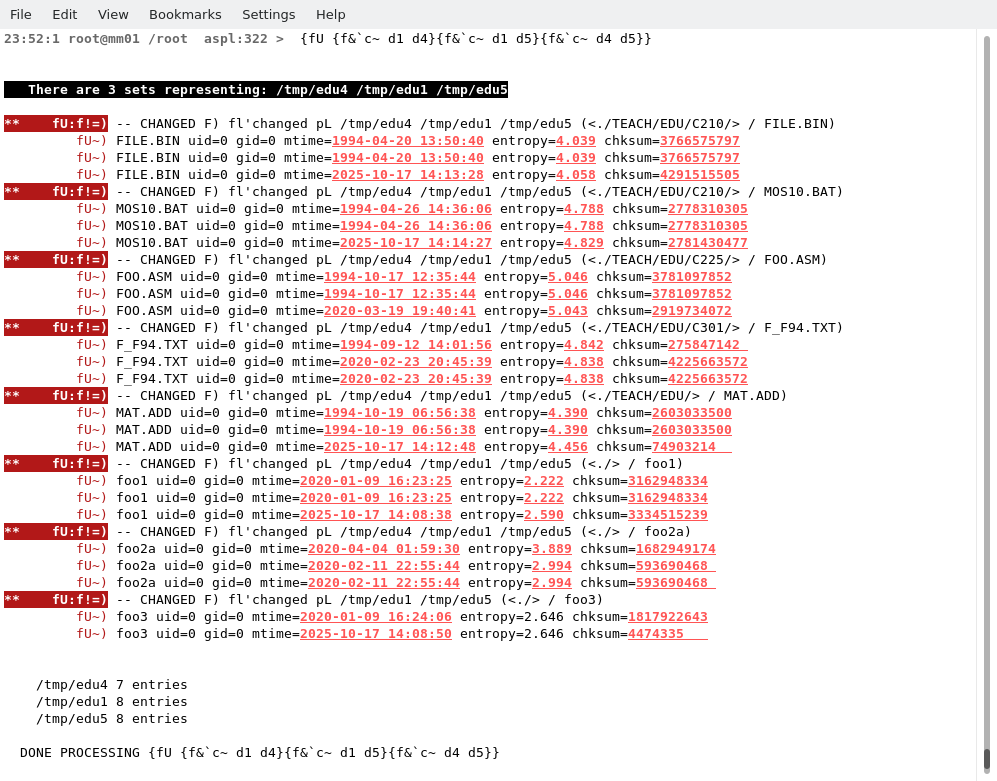 Finding Files with the Same Name but with Different ContentsIn this example, the three set variables d1, d4, and d5, represent the groups of files in three directories /tmp/edu1, /tmp/edu4, and /tmp/edu5, respectively. We want to find these files having the same name but their contents are different.