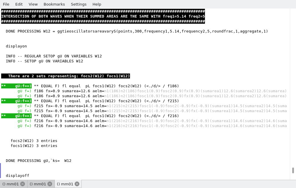 Reassigning the W12 over time causes to turn the variable into a differential group variable: the waves are changing over time along the slight variation of the frequency of the first wave. Therefore we can use the ASPL playop on the group union of the differential group variable W12 to find where the beats occured. The following script, wavesbeat2.pl, is an alternative script to the one shown above. Here on line LL the playop ...