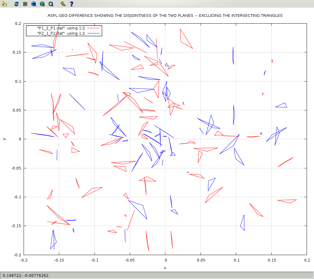 gpdata3 P1_2_P1.dat,1:2wl P2_1_P2.dat,1:2wl-rgb-blue -title "ASPL GEO-DIFFERENCE SHOWING THE DISJOINTNESS OF THE TWO PLANES -- EXCLUDING THE INTERSECTING TRIANGLES"
