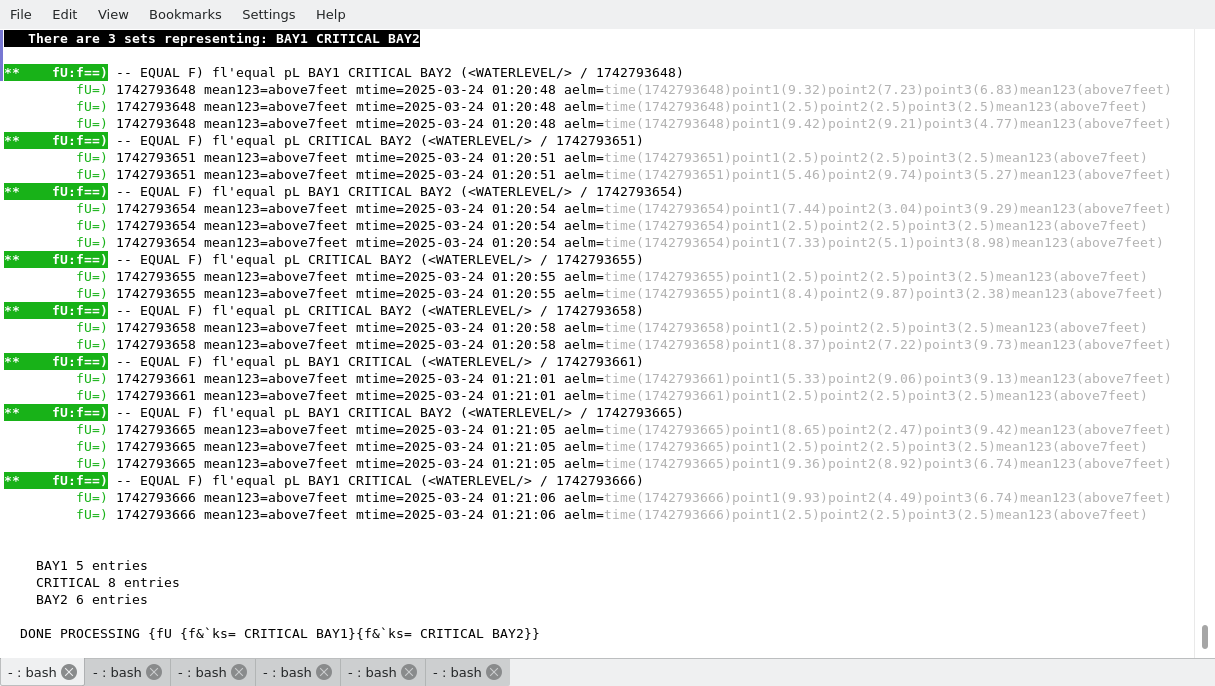 The following figure shows when the water level is critical. Notice that at times 2025-03-28 01:20:48, 01:20:54, and 01:21:05, the water level riched the critical level between BAY1 and BAY2. Before and after these times, the water level was fluctuating, some time it is being critical at BAY1 and some other time at BAY2.