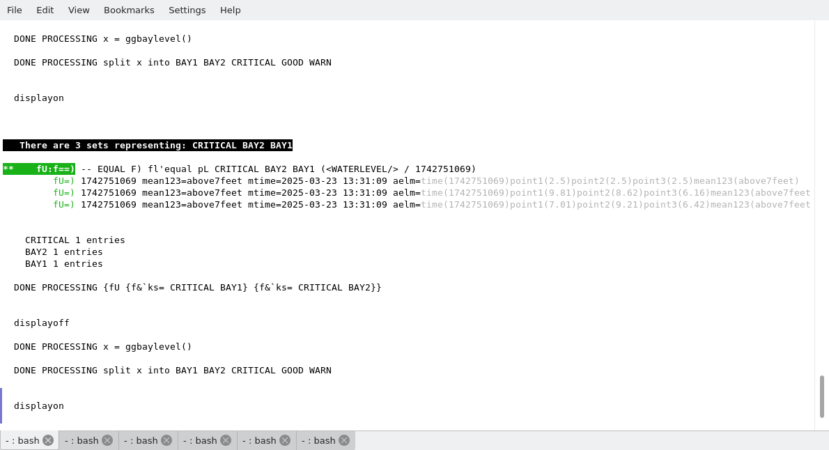 Alternatively, we can use the following one liner shell script to invoke ASPL on monitoring the water level. The command iterrogates the waterlevel in an iterative loop, then display the final result for all the moments when the water level reached a critical point.