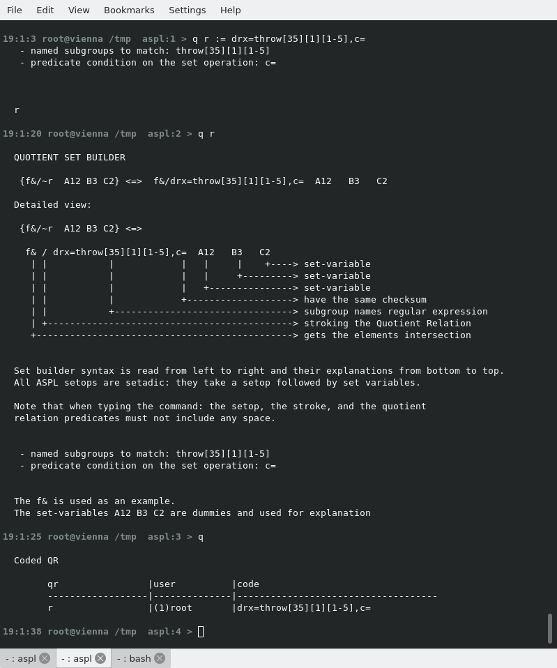 To display the equivalence relation as being seen by ASPL, you can simply type q followed by the relation symbol.