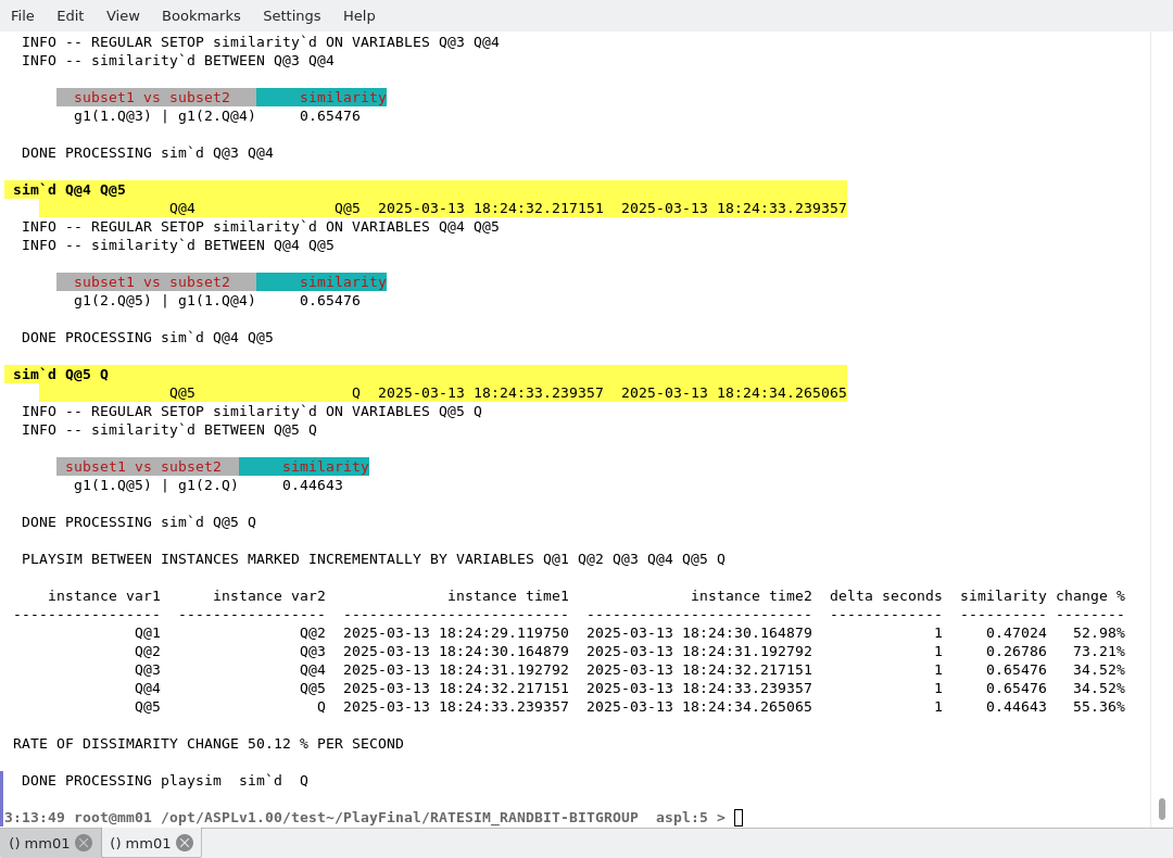 The following terminal shows the output when exercising with the playsim and playchanges in the sample workspace RANDONEBITMIX.