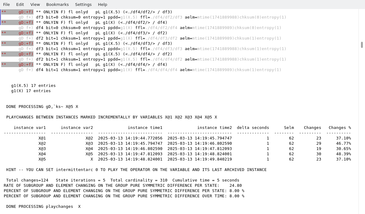 A sample view of playchanges is shown in the following figure. This capture shows the changes between X and X@5 that are one second apart. Note that X@5 is the last instance recorded in the differential group variable X.