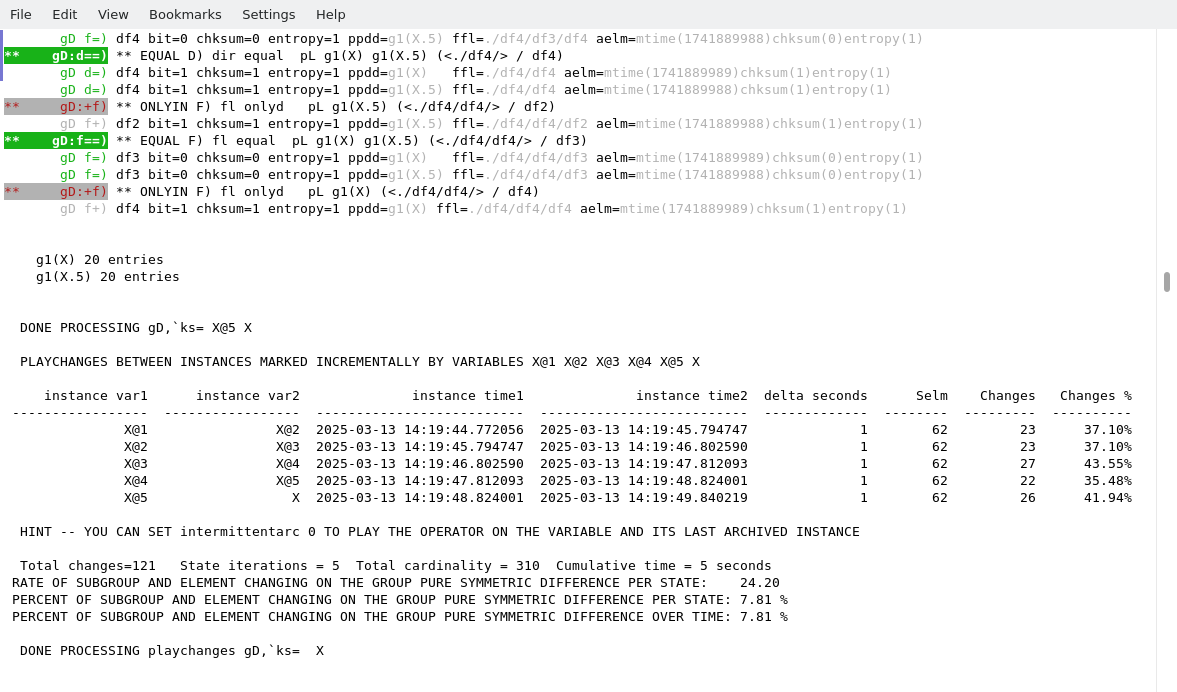 Since the function ggbitsubgS() creates random subgroups and random elements whose attribute bits are assigned randomly to either number 0 or 1, therefore, by invoking the function at different (temporal) time the result is likely to be a different group content. We interrogate the set variable, hence causing it to be archived then updated (turning it into a group differential variable).